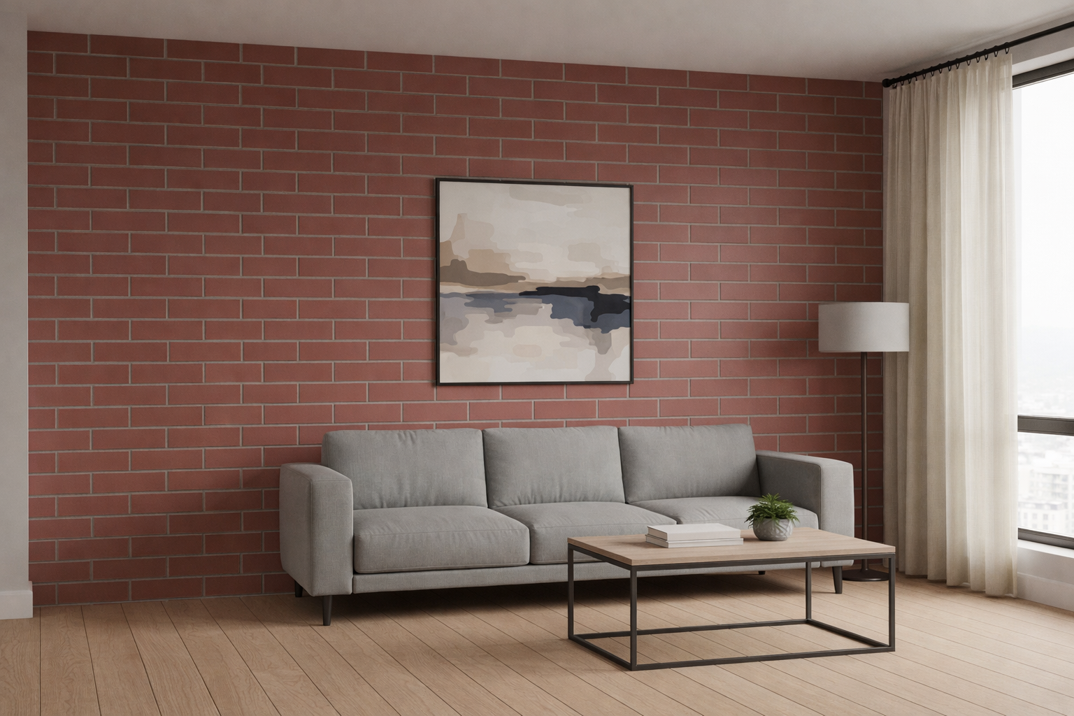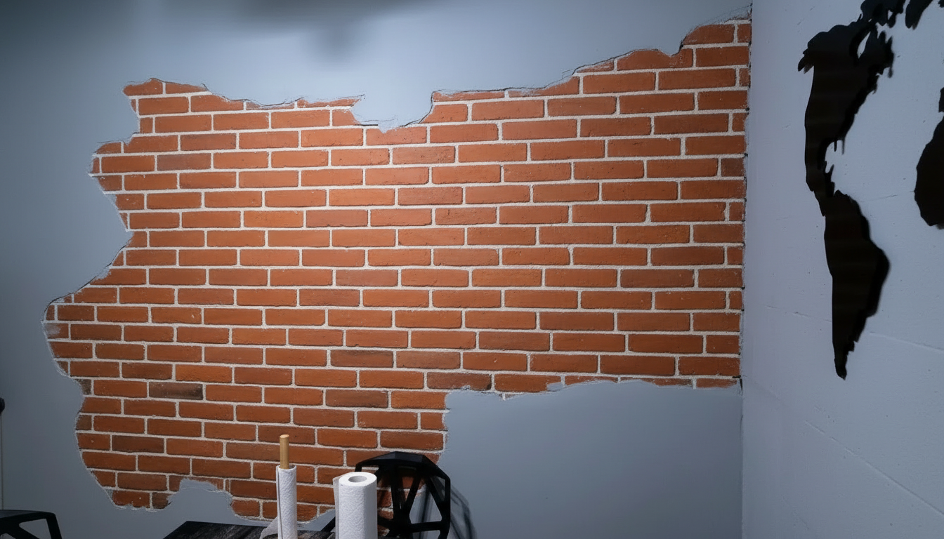 Самая распространенная ошибка — пытаться оклеить плиткой под кирпич всю стену. В типовой квартире это делает комнату визуально меньше и тяжелее. Гораздо эффективнее работает частичная декоративная отделка под кирпич, то есть отдельные фрагменты, как будто штукатурка обвалилась случайно. Такой фрагмент может располагаться в углу, за диваном или вокруг выключателя. Психологически такой прием воспринимается как дизайнерская находка, а не как попытка сэкономить. Более того, частичная отделка создает эффект «истории» комнаты, будто у нее есть прошлое и слои старой отделки.