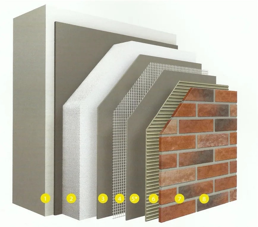 Система мокрого фасада означает, что плитка клеится не на стену, а на слой утеплителя. Это популярное решение для энергоэффективных домов, но требует строгого соблюдения технологии. Полный пирог включает несколько обязательных слоев. Сначала идет стена с клеевым составом, затем крепится утеплитель из минваты или пенополистирола, который фиксируется тарельчатыми дюбелями. После наносится базовый клеевой слой с утопленной в него армирующей стеклосеткой, затем выравнивающий слой, финишный клей и заключительным слоем сама декоративная фасадная плитка под кирпич. Армирующая сетка обязательна, без нее утеплитель будет играть при температурных деформациях, микроподвижность передастся плитке, и она покроется трещинами.